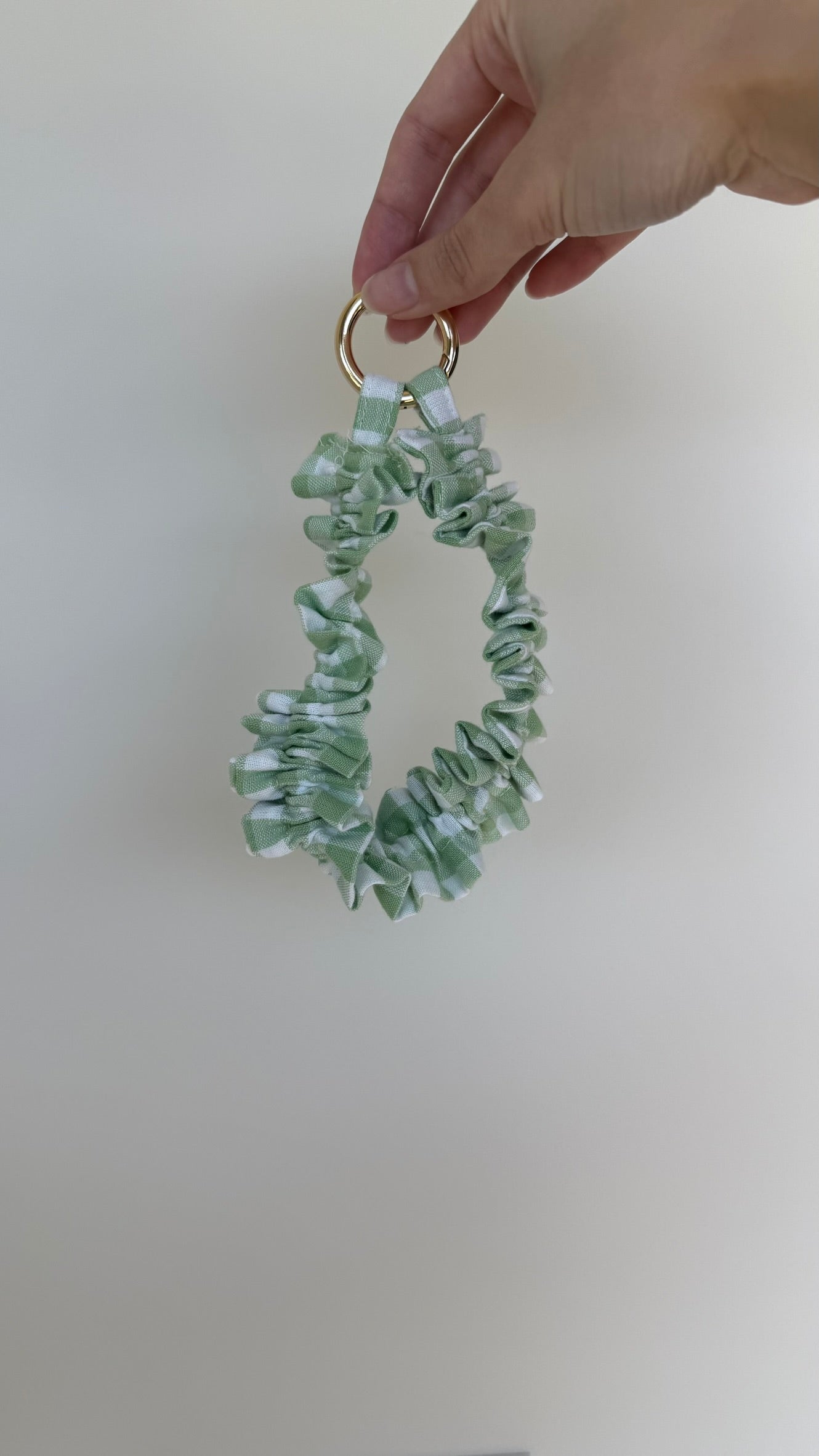 Keywords: gingham phone strap, green wristlet, cottagecore phone lanyard, cute fabric keychain